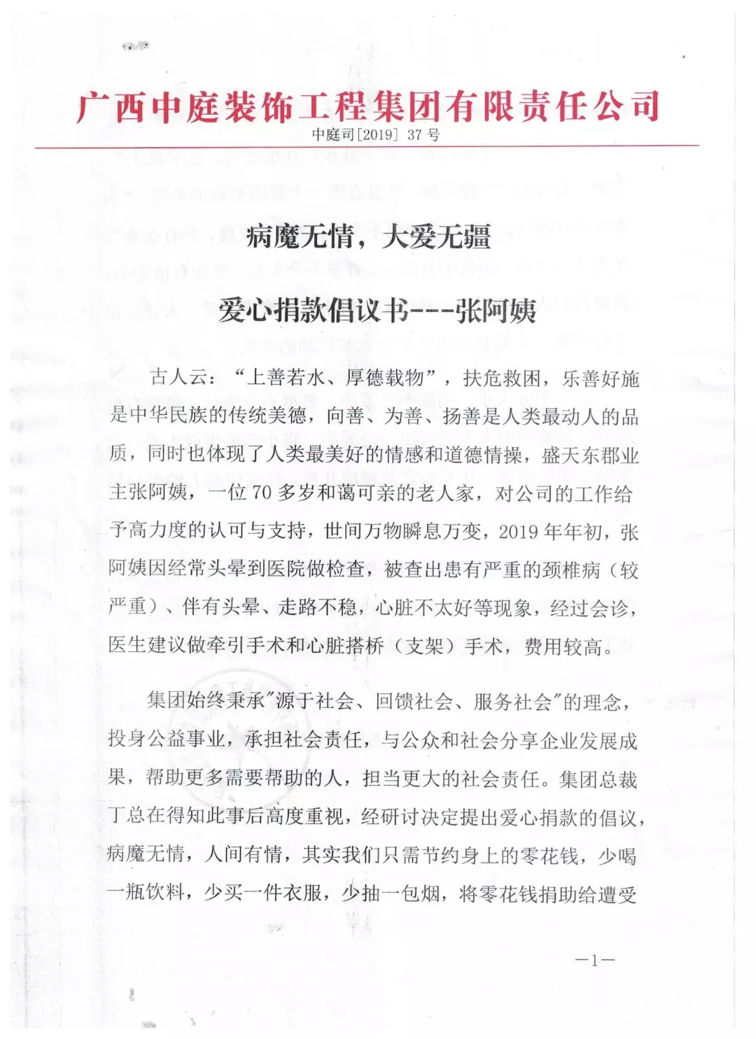集團(tuán)總裁丁胡先生向全體員工號召,為張阿姨獻(xiàn)出一份愛心。捐款不分多少,貴在有份愛心,只要我們?nèi)巳硕寄芨冻鲆稽c愛、將小愛匯聚成大愛,大愛必定驅(qū)趕病魔,大愛定能早日治愈張阿姨的疾病。