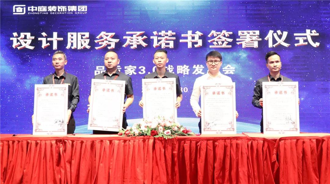 ▲中庭裝飾副總經(jīng)理鄒恒元帶領(lǐng)設(shè)計(jì)團(tuán)隊(duì)管理人員簽署設(shè)計(jì)服務(wù)承諾書