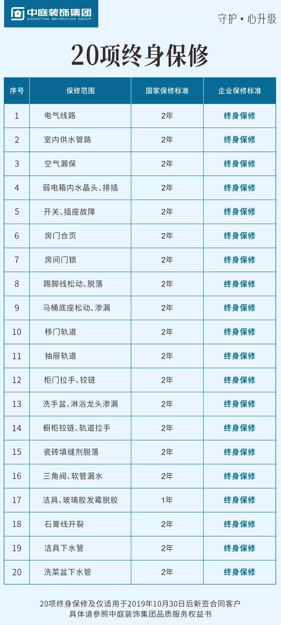 中庭裝飾集團20項終身保修上線,按照國家有關(guān)規(guī)定,保修標(biāo)準為兩年的20項家裝工程,我們承諾終身保修!