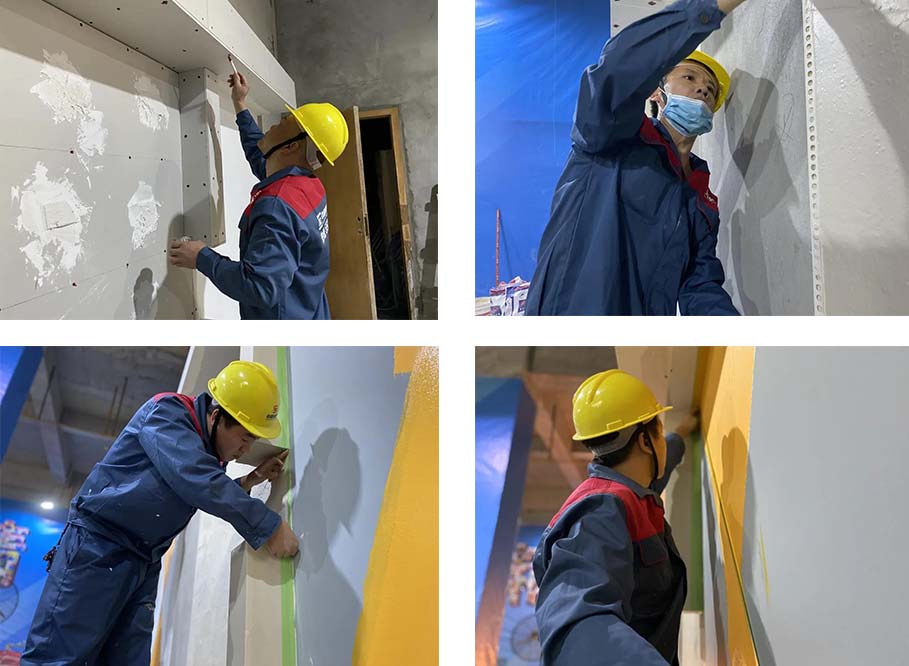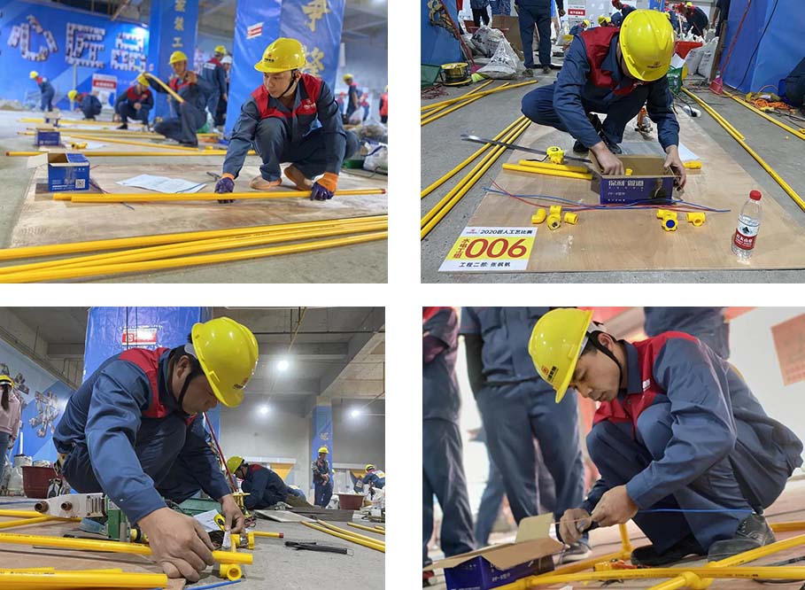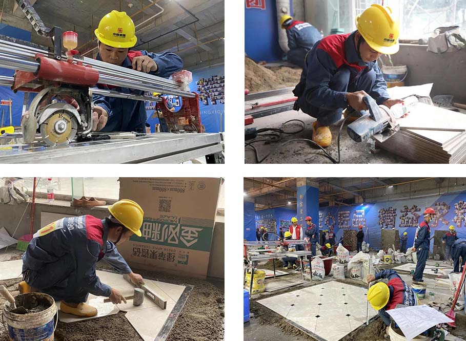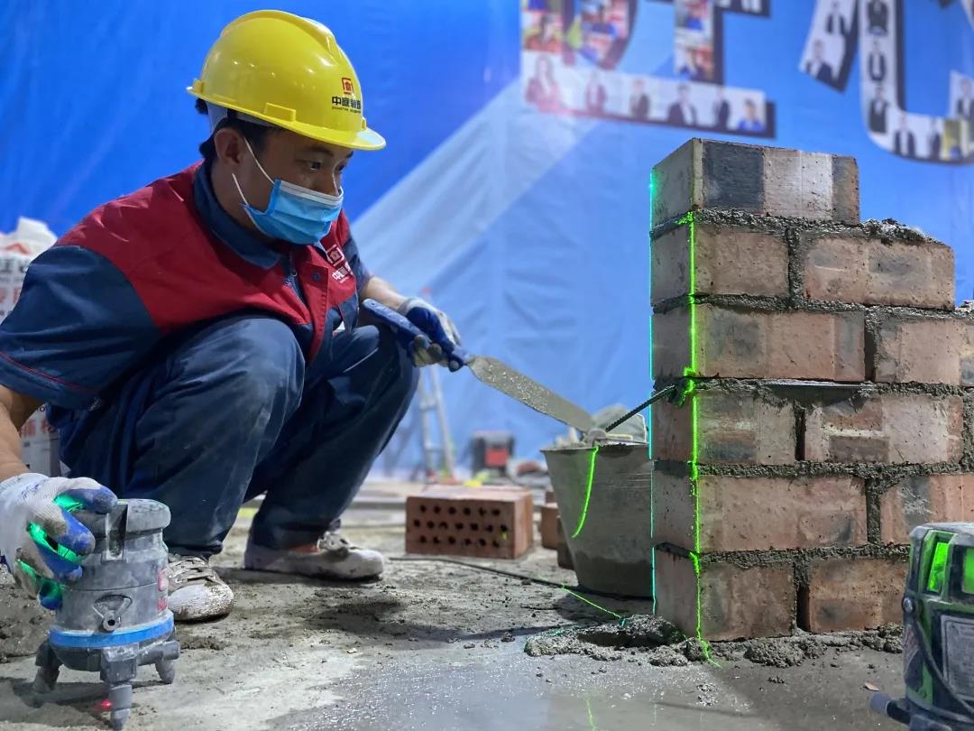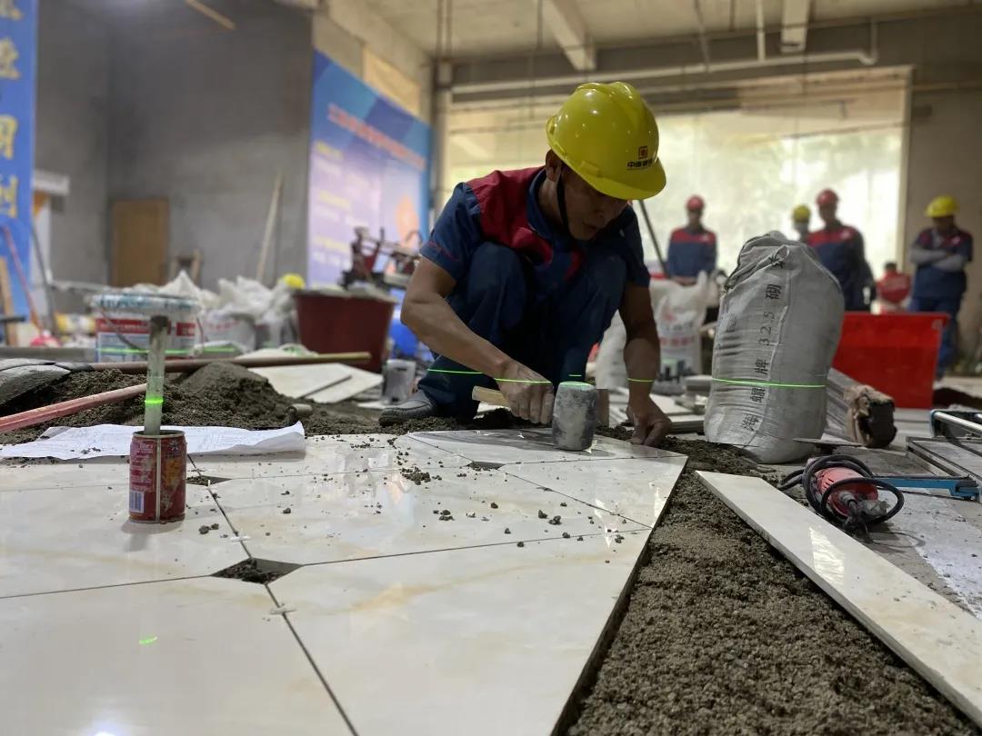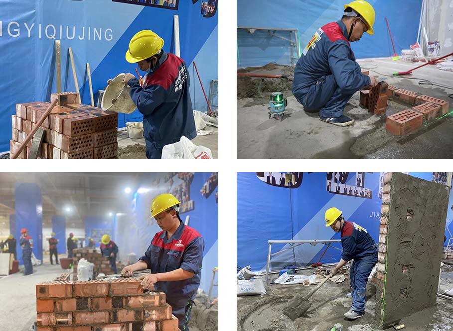 現(xiàn)場一共有土建組、水電組、瓦工組、膩?zhàn)咏M四大工種賽區(qū),參賽選手在相對應(yīng)的工位,根據(jù)圖紙要求進(jìn)行比賽。