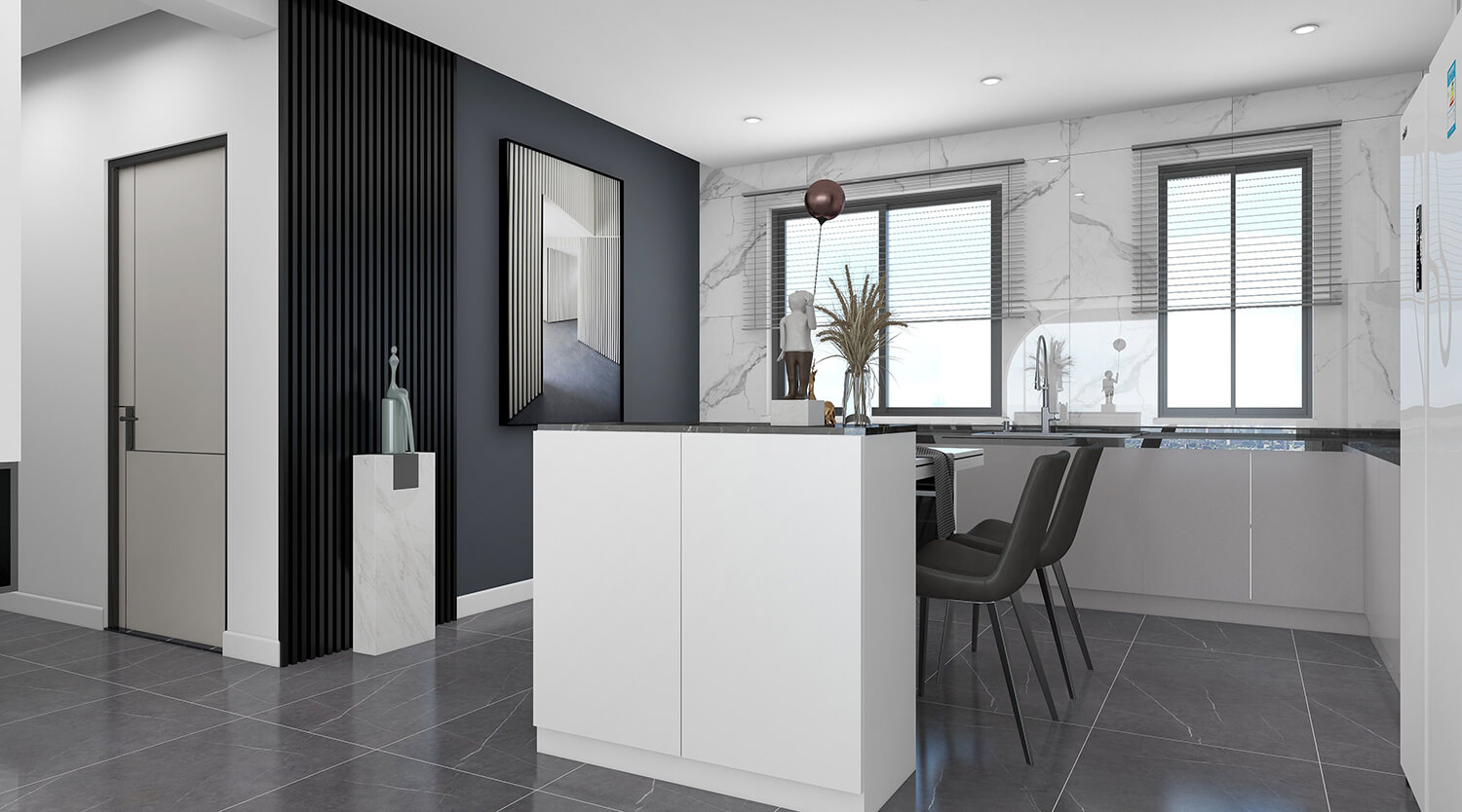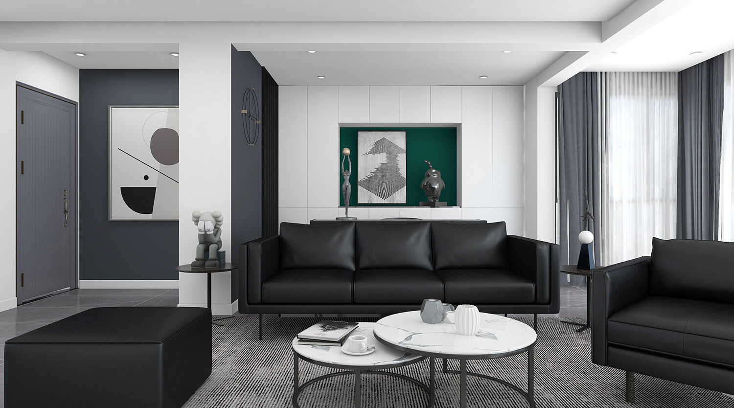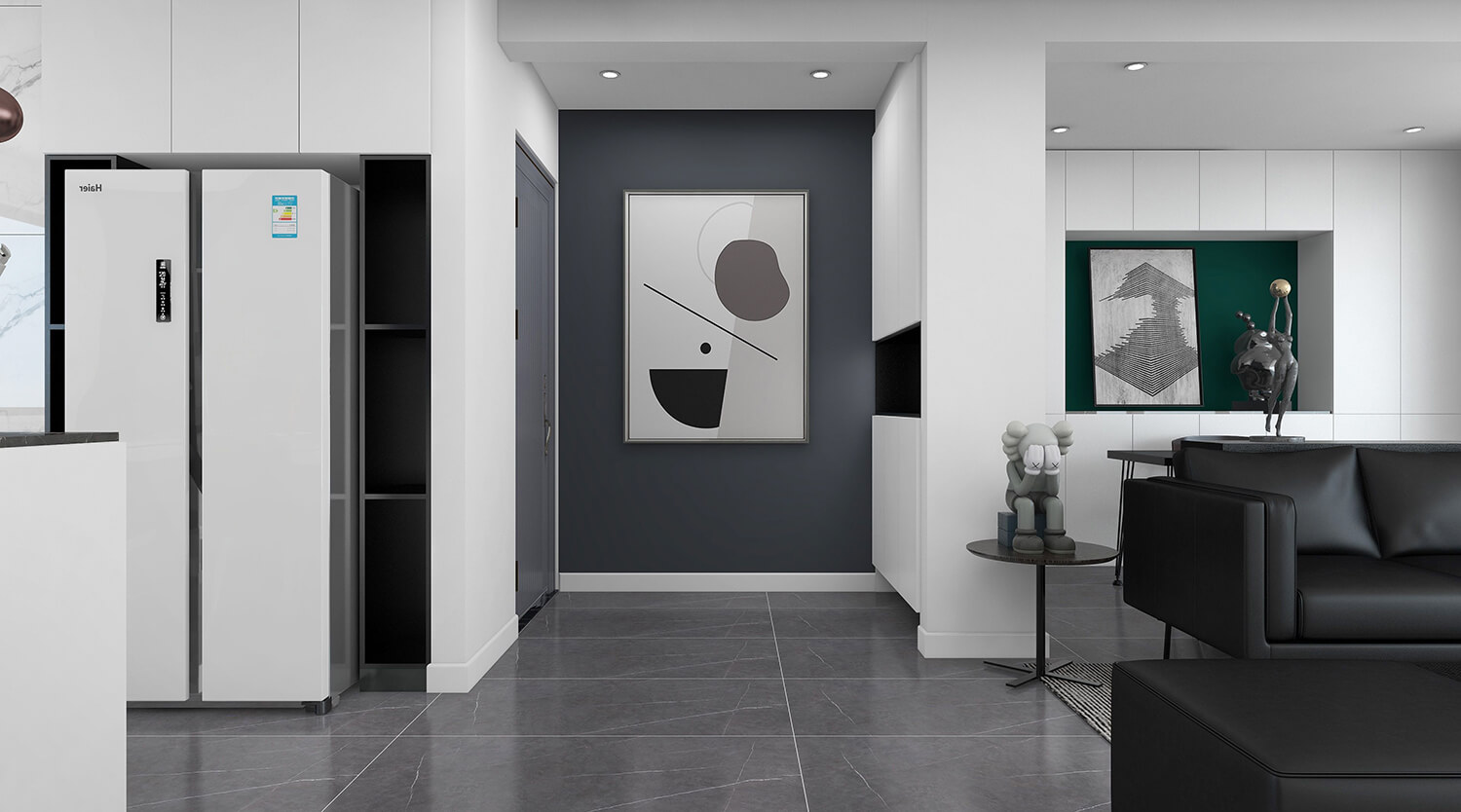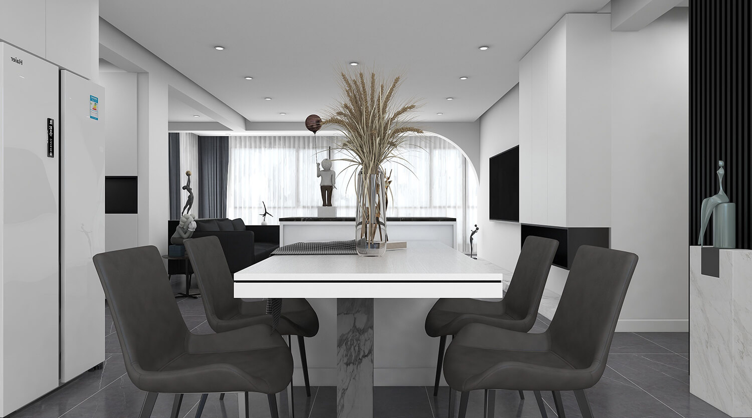 本案總面積為120㎡。設計師秉承簡潔、舒適的設計理念,整體以黑白灰為主,沒有多余的裝飾,線條簡單,室內空間大方。簡約風格的設計不是缺乏設計要素,而是一種更高層次的設計境界。在滿足功能需求的前提下,將空間、人及物品進行合理精致的組合,用最洗練的筆畫,描繪出最簡潔素雅的空間效果。