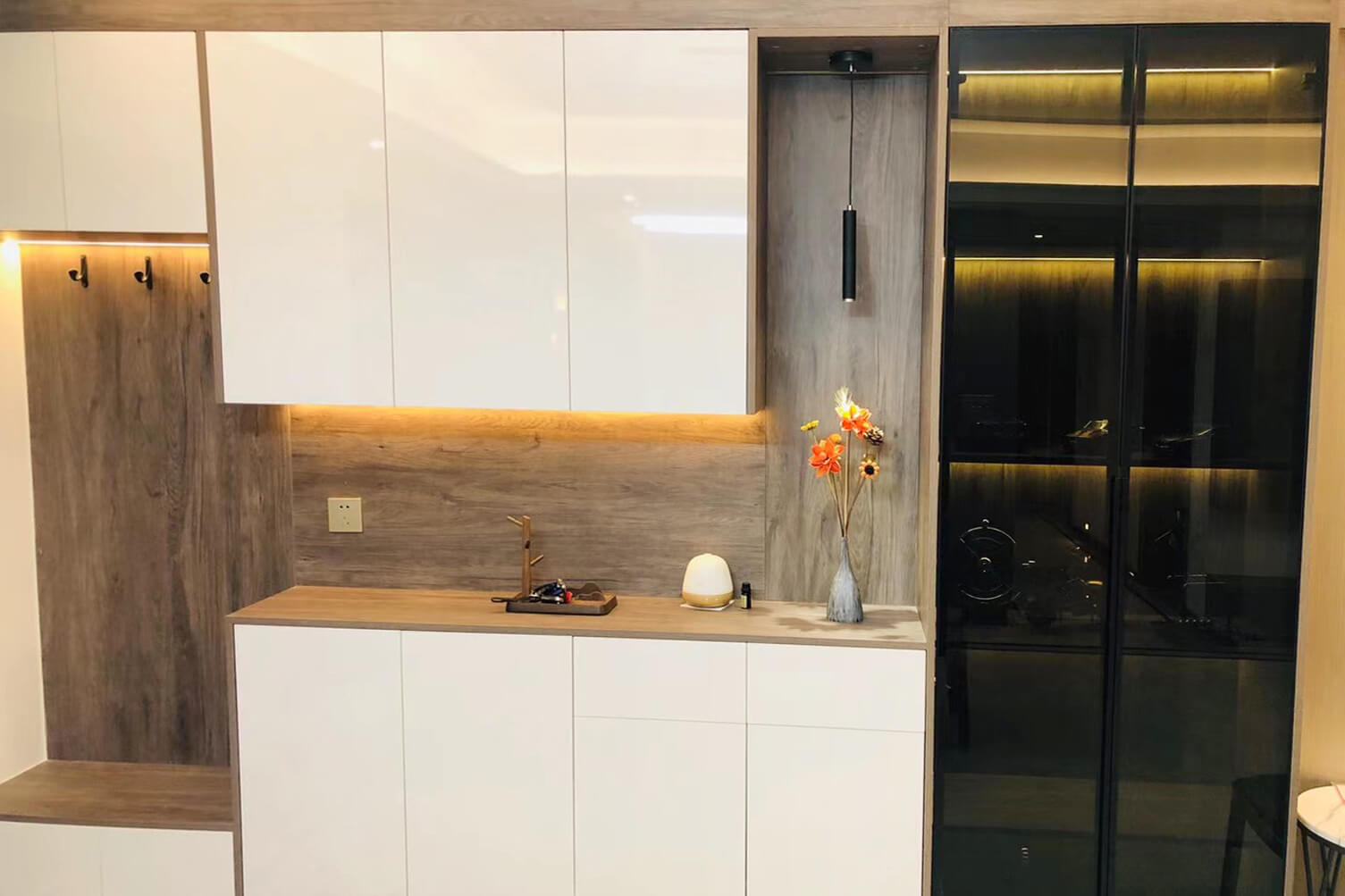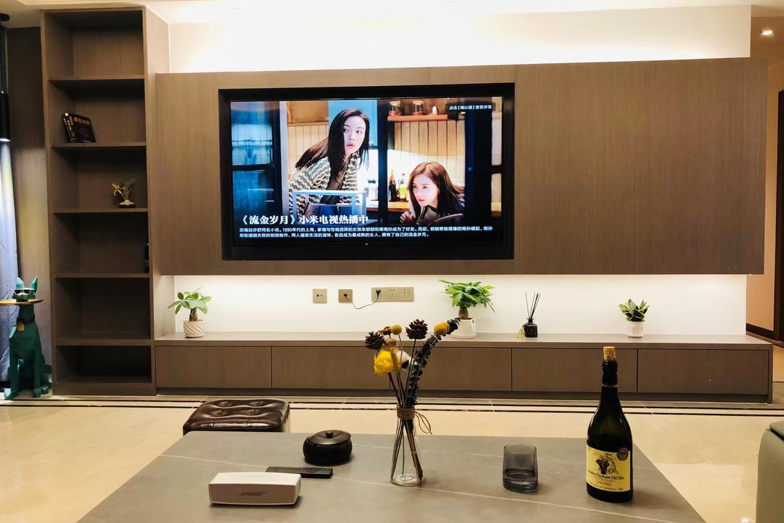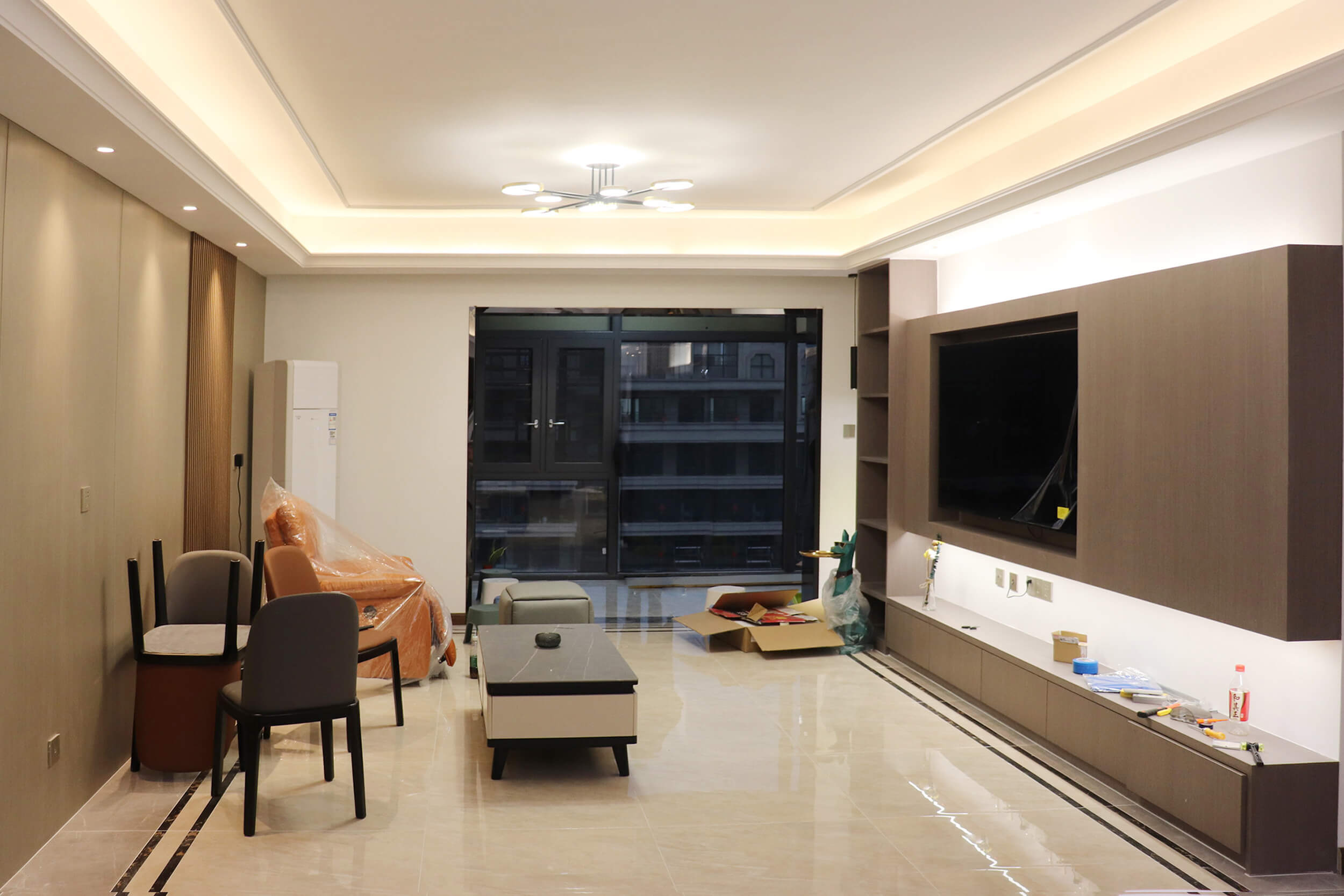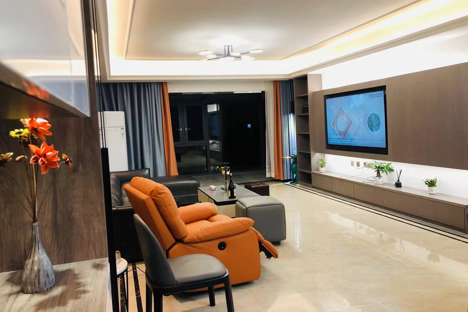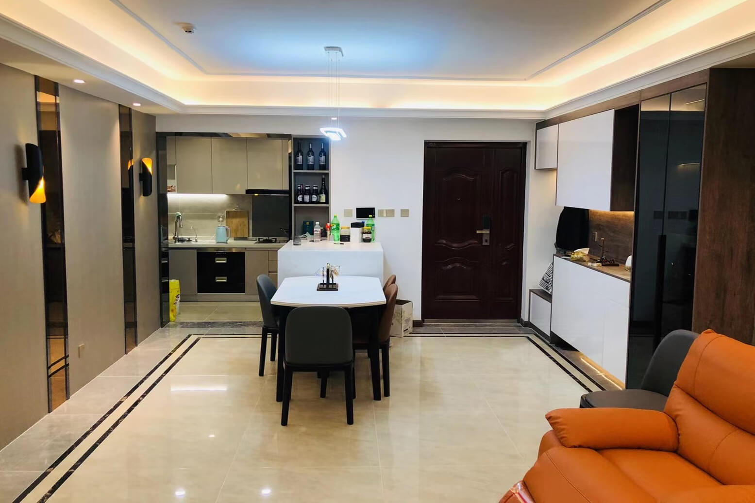 瀏覽量:347客餐廳選擇素色的木飾面顯現(xiàn)低調(diào)有內(nèi)涵,整個(gè)客廳及餐廳的吊頂直接一體貫穿,搭配著電視背景墻長(zhǎng)方體設(shè)計(jì)突顯空間的寬闊大氣,愛馬仕橙色的窗簾及單人沙發(fā)的呼應(yīng),增添了空間的活躍性;暖黃色燈光下白色的大理石吧臺(tái)及白色的高光柜門使得空間不再昏沉,局部黑色的鈦金夾著茶色的鏡面在大面積的素色木飾面的包裹下將現(xiàn)代的低調(diào)且奢華體現(xiàn)完美的體現(xiàn)了。