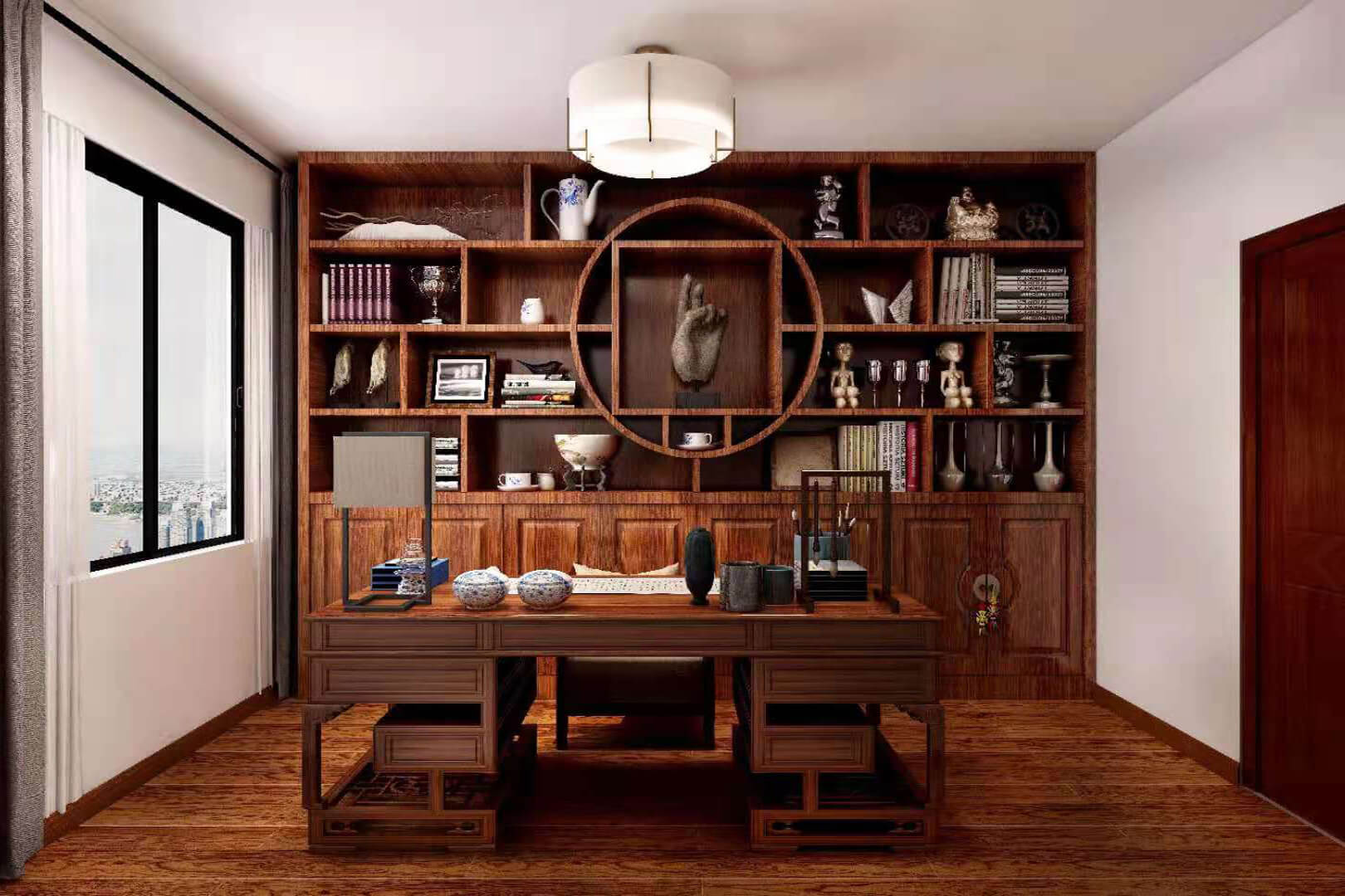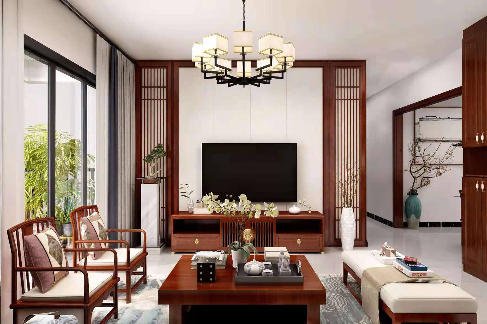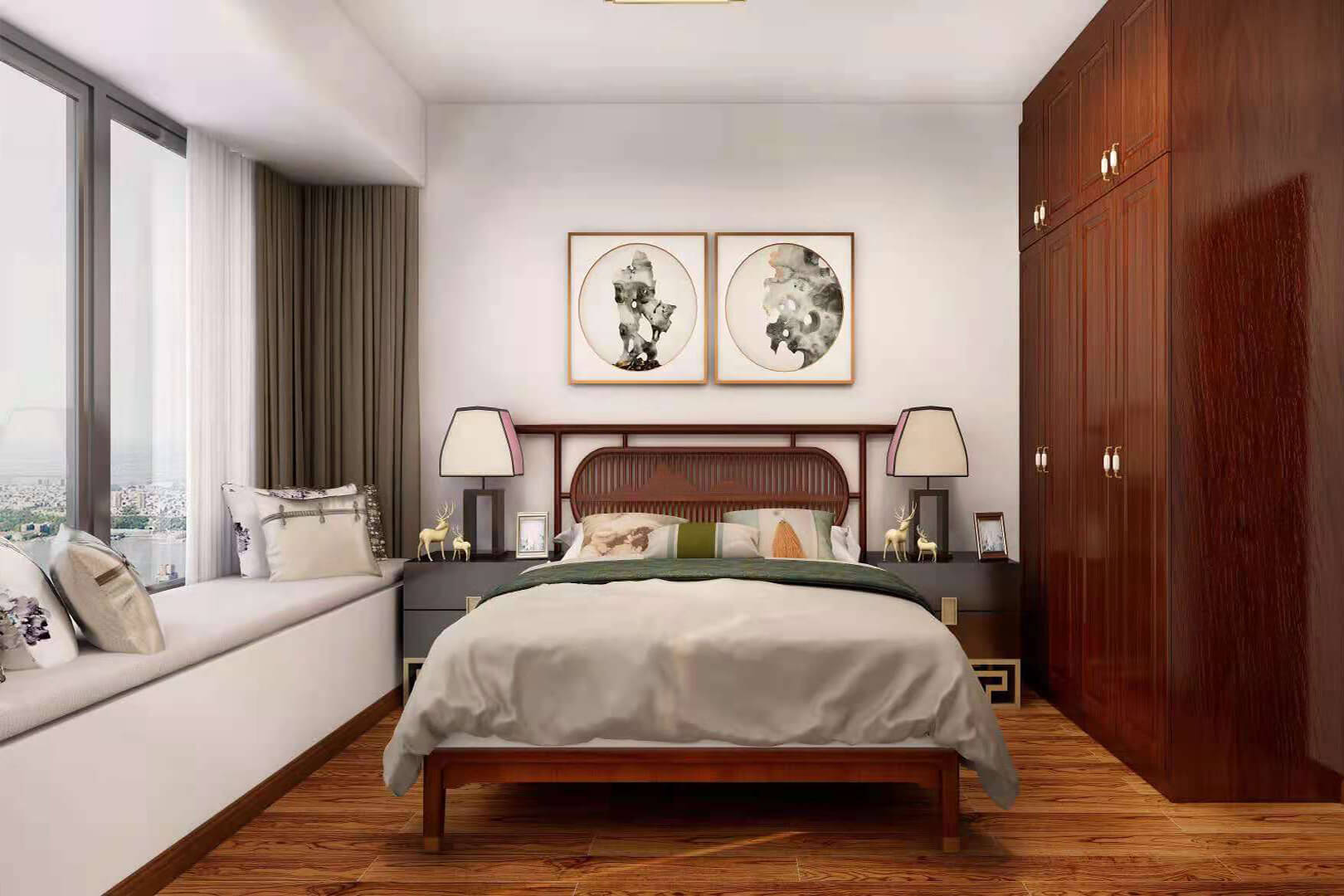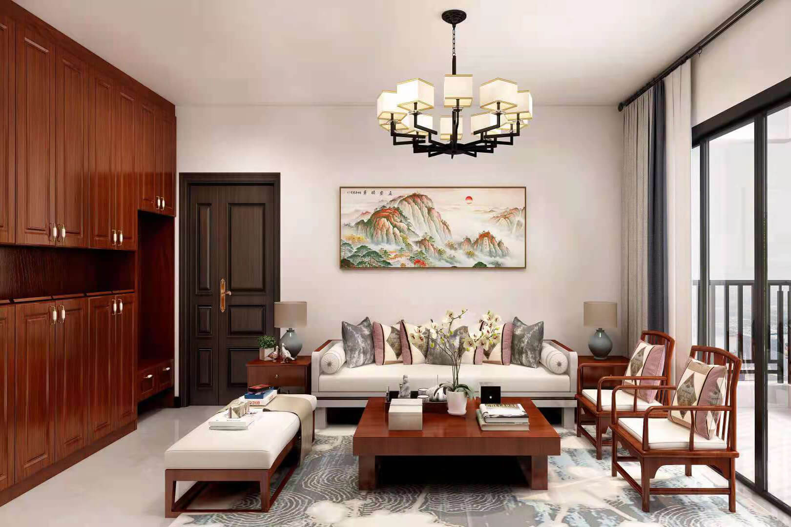 瀏覽量:557房子整體家具以紅木為主??蛷d采用白色地磚和留墻面與家具搭配讓顏色看起來更為簡潔,不做裝飾的吊頂讓整體的空間看起來更寬大。房間采用紅木地板與房間家具色彩呼應(yīng),墻面留白用水墨畫裝飾讓房間裝飾更豐富,也讓色彩更多了層次感。