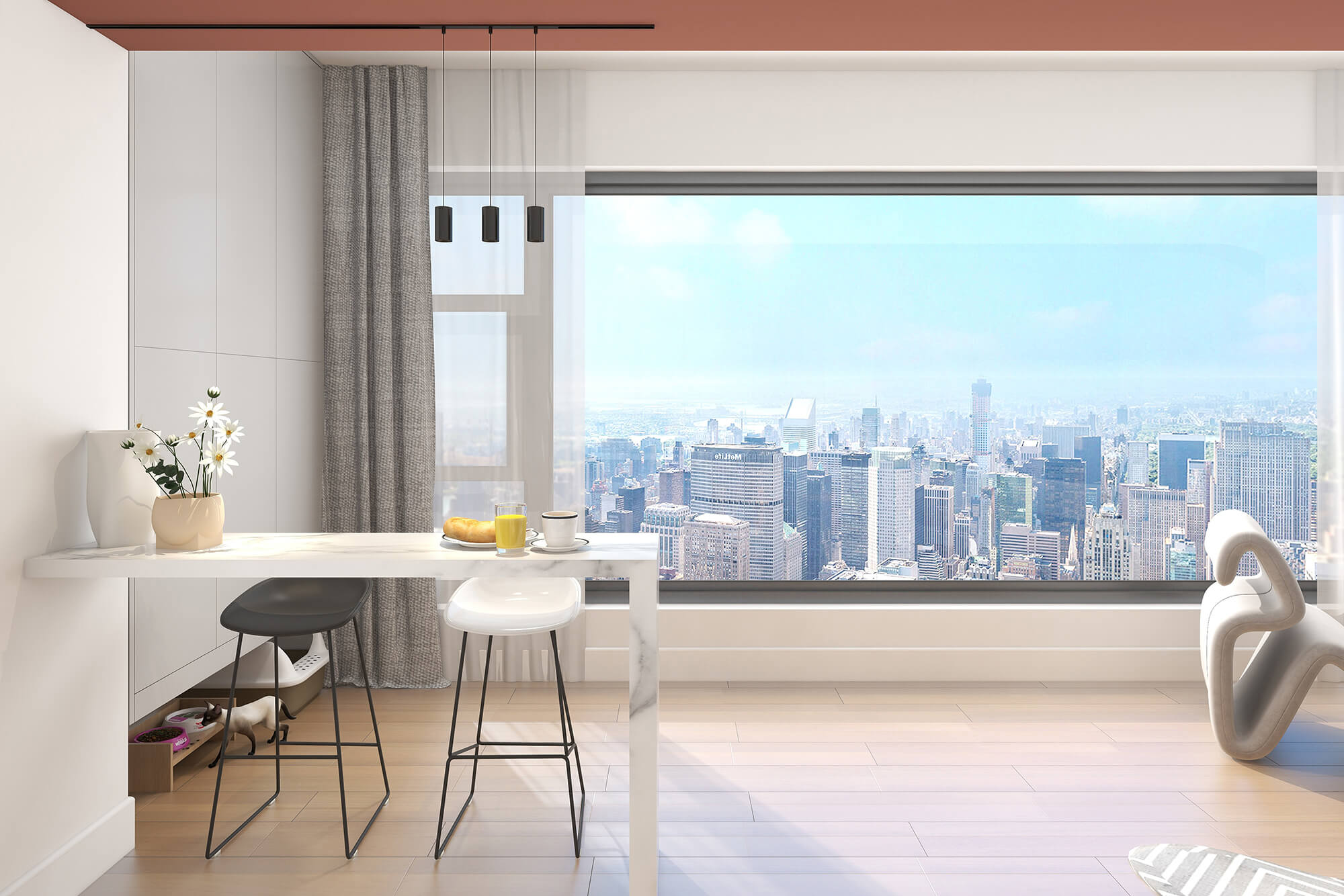 本案設(shè)計(jì)師基于人與動(dòng)物、環(huán)境之間的大融合的考慮,實(shí)現(xiàn)了人們想要追求的一種泛空間,家庭不再是以空間而定位,而是以氛圍而定位。比如說男女主人在辦公的時(shí)候,可以在客廳、餐廳跟貓咪玩耍,或者在做飯的時(shí)候也能夠和外面的人互動(dòng),空間既獨(dú)立又融合。