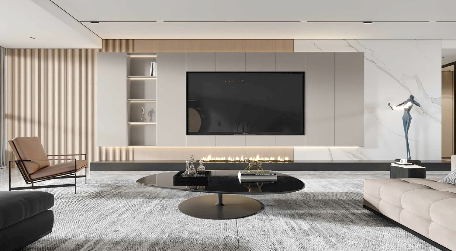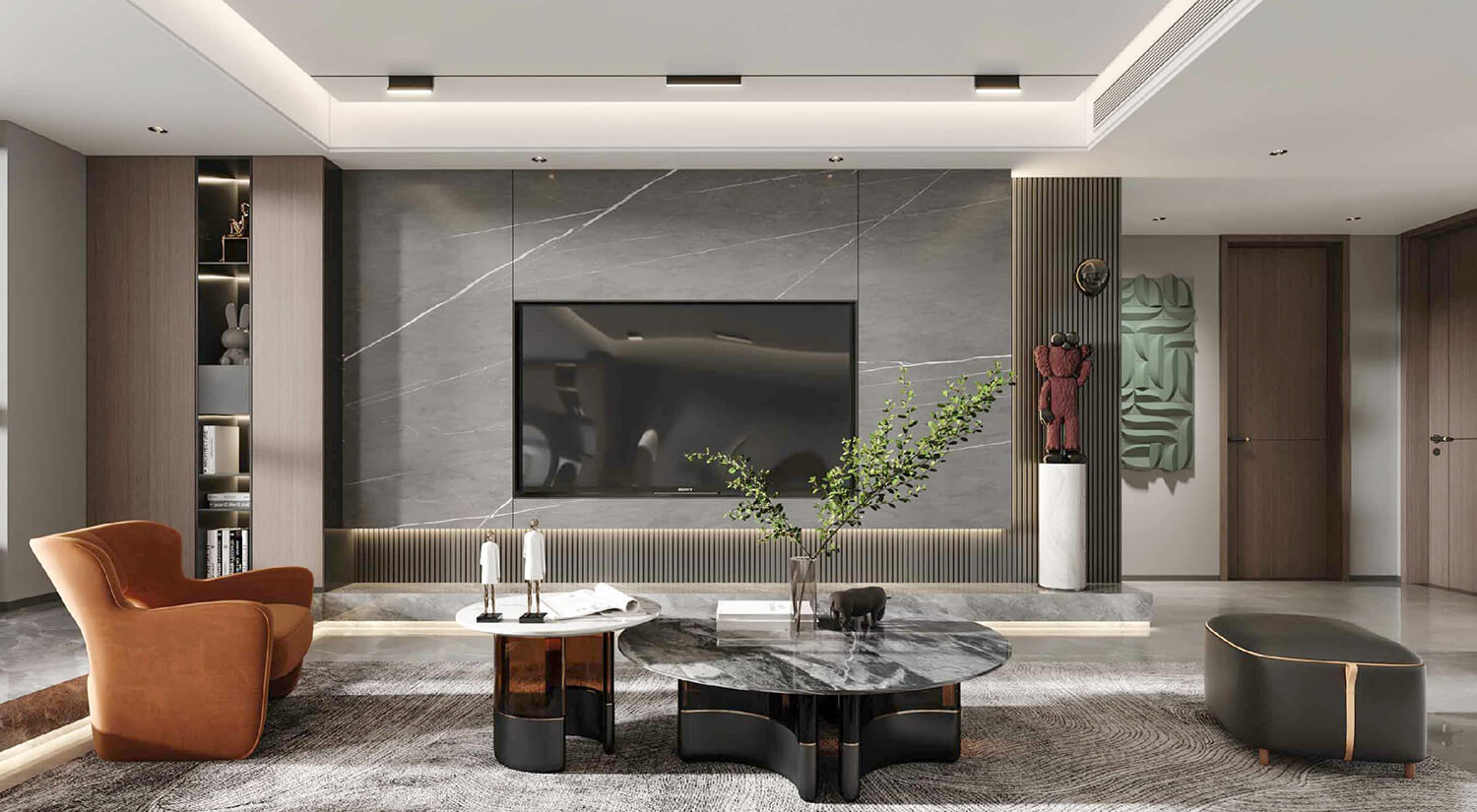 現(xiàn)代輕奢風(fēng)格的特點(diǎn)之一是注重材質(zhì)的選擇和質(zhì)感的呈現(xiàn)。在空間設(shè)計(jì)中,通常使用大面積的高檔材質(zhì),如天然大理石、優(yōu)質(zhì)實(shí)木、高級(jí)石材等,這些材質(zhì)可以為空間營造出一種高貴、奢華的感覺。