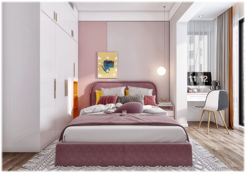 公主房主體以粉色輔以大面積留白,主體粉色吸引目光美麗溫馨,而充滿樂趣,大面積白色代表純潔,充分表現(xiàn)了少女的甜蜜純潔,在此之中輔以橙色在美麗中又不缺活潑,一點(diǎn)點(diǎn)灰色豐富整個(gè)畫面感帶有端莊,房間陽臺(tái)外擴(kuò),充分利用空間開闊明亮。