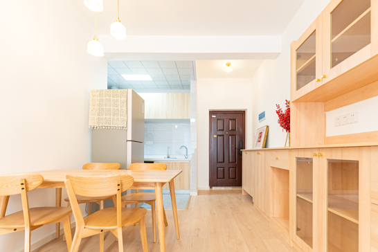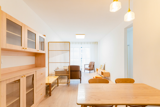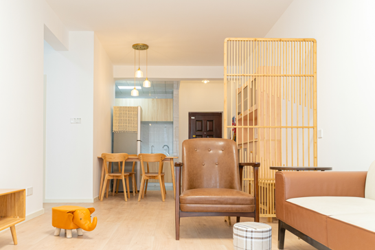 整個(gè)空間基于原木風(fēng)格上做搭配,陽臺(tái)打通,解決不互通的采光問題,天氣陰晴,都可以為空間做天然點(diǎn)綴;開放式廚房和餐廳可以共享操作,互不干擾,又可以加強(qiáng)家人之間的互動(dòng)性提高家庭的幸福感。