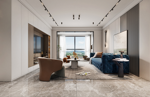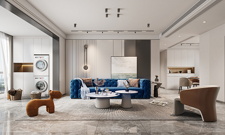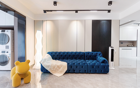 使用更親近自然的棉、麻、木搭配黑、棕、白、灰色,在裝飾上極度的克制,給人高品質,舒服的感受。削弱復雜造型和色彩對人情緒的影響,反而產(chǎn)生了治愈的力量??巳R因藍沙發(fā)的點睛之筆,顯得整個空間更加自信,給人傳遞高級的視覺感受。