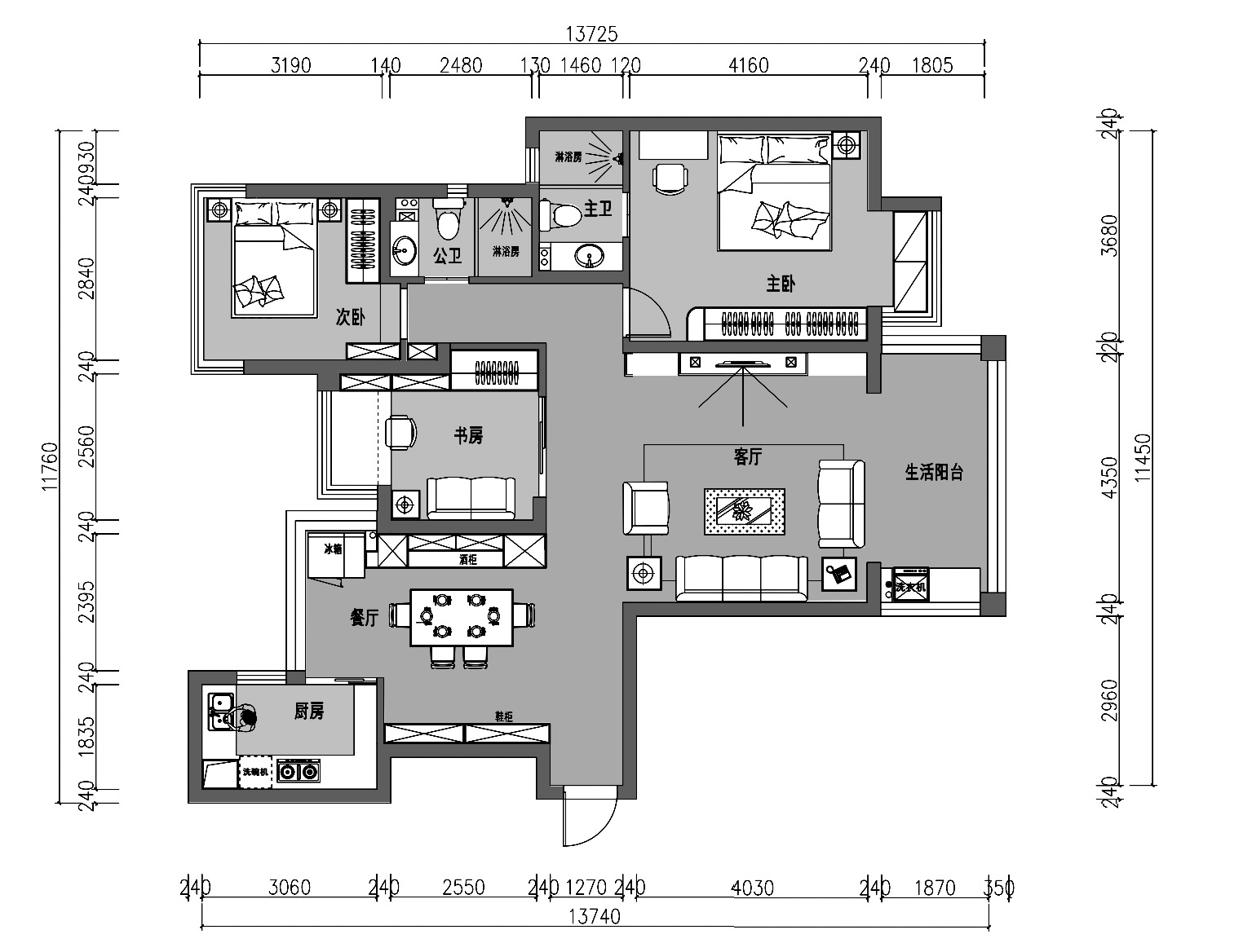 1、改變書房的開啟方向,面朝客廳,實現(xiàn)客廳及書房的南北通透。補充客廳的采光,實現(xiàn)活動及私人空間的分區(qū)更加明朗。