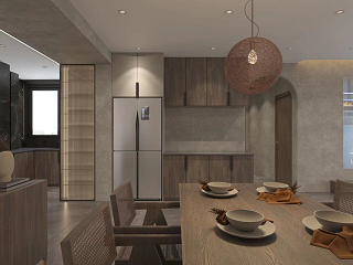 整體風(fēng)格走向?yàn)閬骷棚L(fēng),還原生活的樸素與寧靜,這個(gè)戶型的痛點(diǎn)是廚房過小,入戶沒有玄關(guān),且采光差。設(shè)計(jì)把原有廚房往外擴(kuò),與原有入戶形成有序的一體動(dòng)線。開放式廚房,嵌入式冰箱巧妙設(shè)計(jì)與原有柱子融為一體。